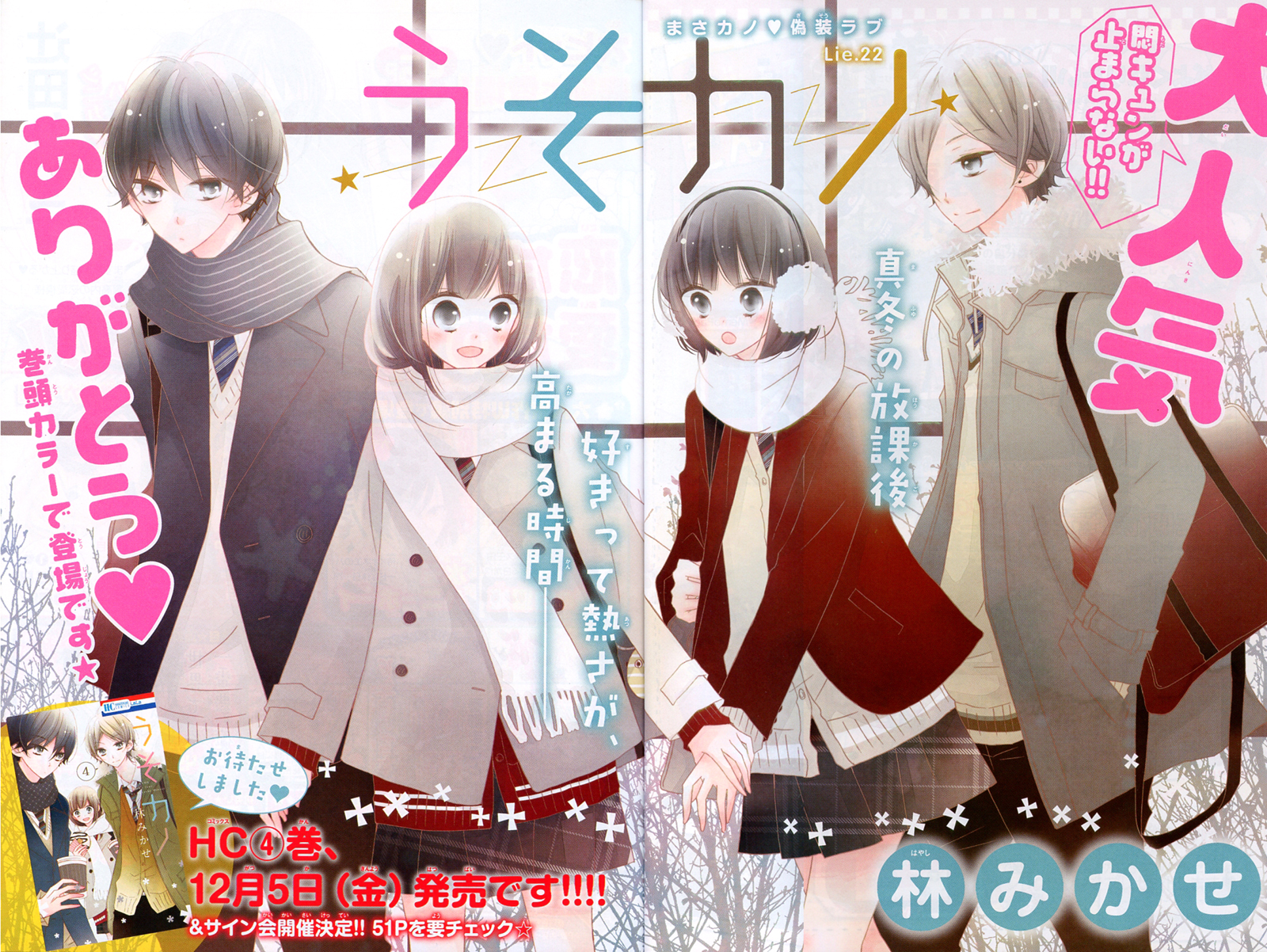 Calendar_059The furoku is a “Natsume Yuujincho” 2015 calendar and planner (which I am currently using.)Calendar_069The frontis page spread for “UsoKano” Lie 22.