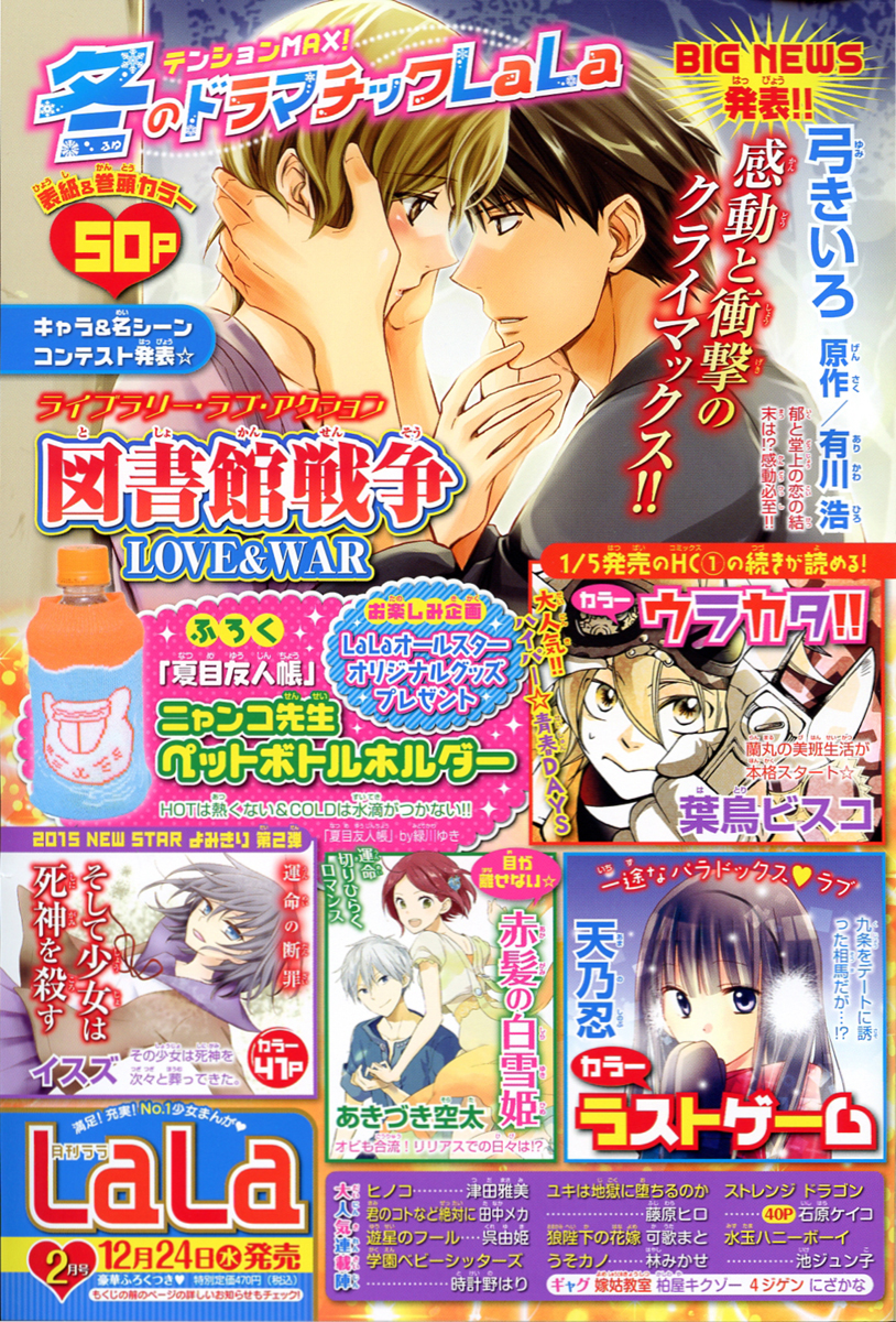Calendar_068And lastly, here are the previews for Lala 2/2015. The furoku will be a Nyanko-Sensei drink bottle cozy. “Library Wars” will finally come to an end. I’m looking forward to a happy and romantic ending. There will be a oneshot “Soshite Shoujo wa Shinigami wo Korosu” (“And the Girl Kills the Grim Reaper”). The preview reads, “This girl buried Shinigami one after another.” This oneshot is by Isuzu, the same mangaka who gave us “Mimi ga Kieta Hi” (“The Day Mimi Disappeared”.) Hmm… This could be interesting.