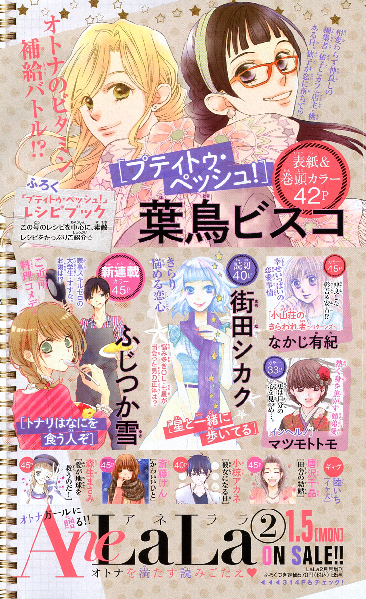- Bisco Hatori’s “Petite Peche” returns! It will be on the cover and will have color pages. Of course, I’m looking forward to the continuation of the story. In honor of “Petite Peche”, the furoku will be a cookbook!