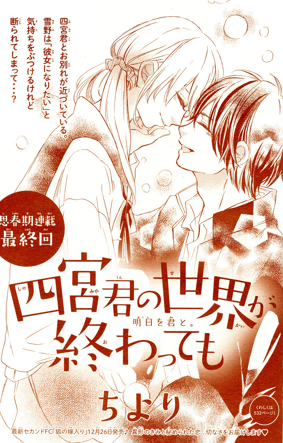 Here is the frontis page for the final chapter of “Shinomiya-kun no Sekai ga Owattemo”.