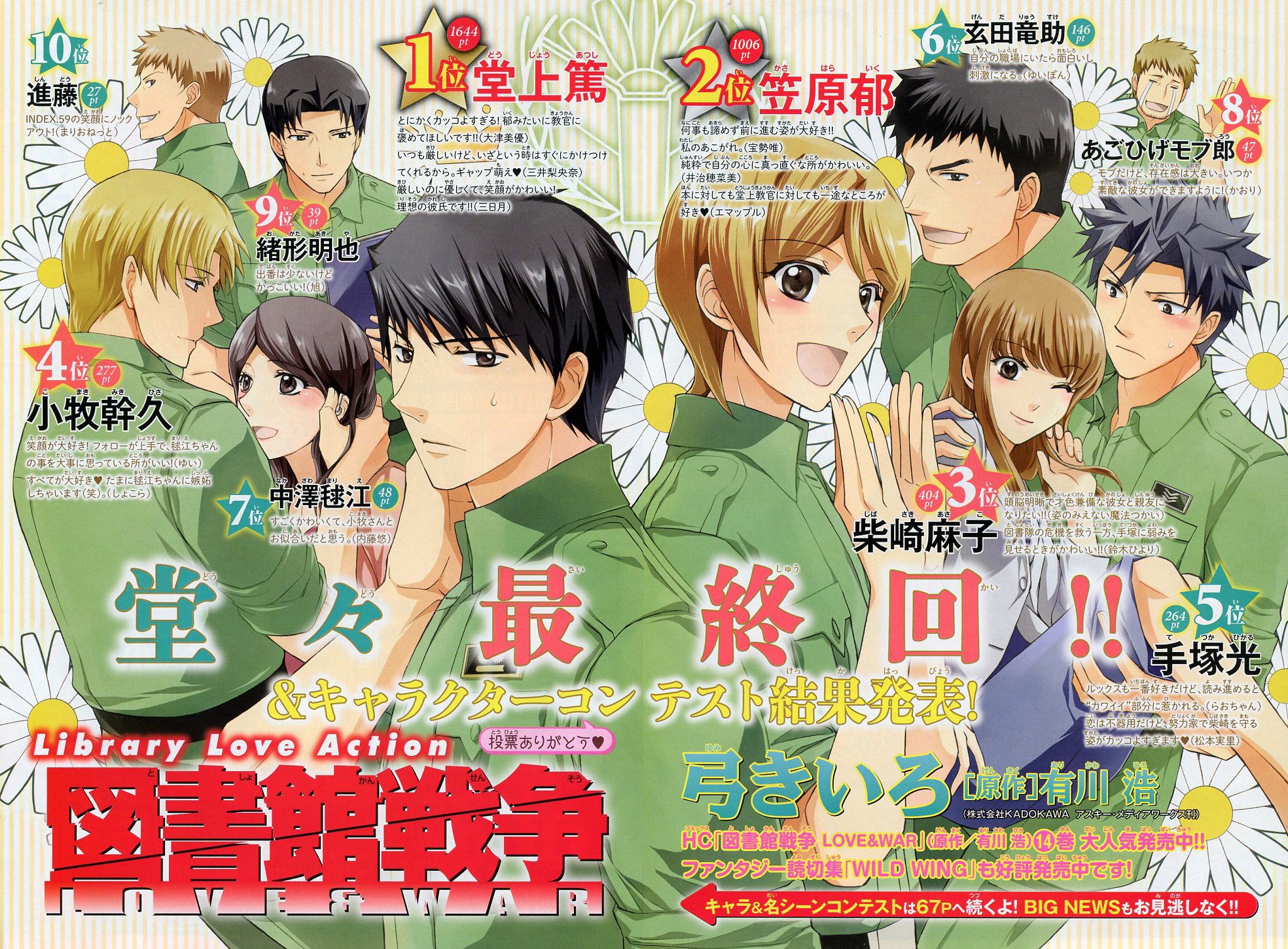 And now for some “Library Wars: Love & War” spoils. The frontis spread features the results of the reader’s favorite character poll. I’m partial to Shibasaki.
