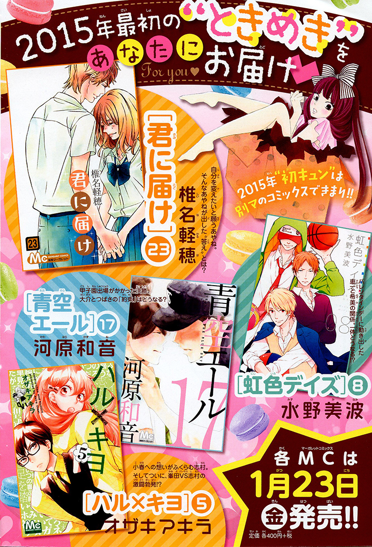 “Kimi ni Todoke” is on the cover of the February issue of Betsuma. The first furoku is a set of 6 postcards from “Ao Haru Ride” and “Strobe Edge”. Here’s what they look like: